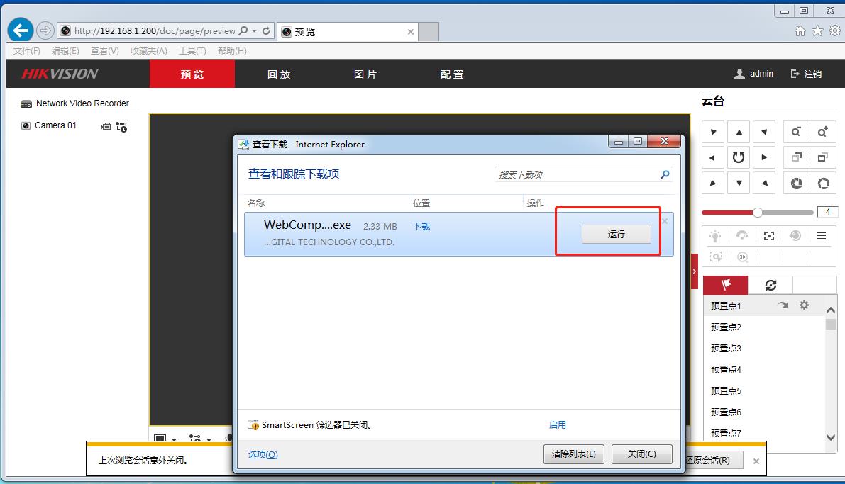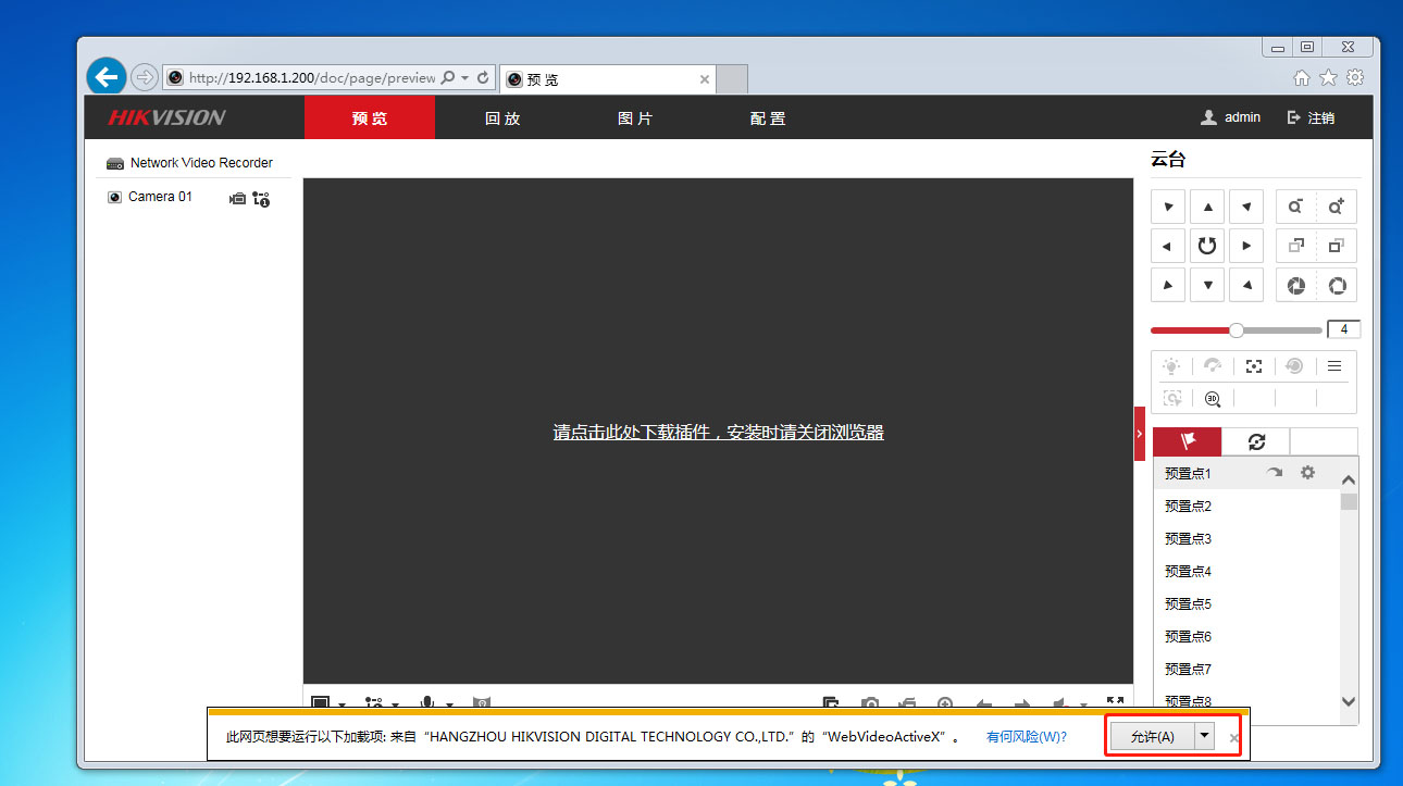 4、 重新打開瀏覽器,輸入海康威視錄像機IP,登錄到錄像機,如下圖,點允許。