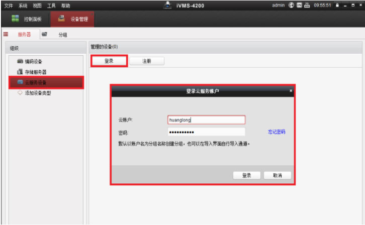 若已有相關螢石云賬戶,請使用鼠標左鍵單擊“登陸”,輸入已注冊的螢石云服務賬戶、密碼,即可登陸該賬戶,查看該螢石云賬戶下相關視頻。